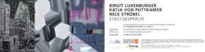 Drei Künstlerinnen begegnen sich in der Auseinandersetzung mit dem urbanen Raum. In einer gemeinsamen Ausstellung wollen sie die Schnittmengen ihrer Positionen ausloten. In ihren Fragestellungen gehen sie in ganz unterschiedlichen Handlungen nach, in der Wahl ihres jeweiligen Materials und der gestalterischen Anordnung in Raum und Bild. Ihre zwei- und dreidimensionalen Arbeiten oder auch raumgreifenden Installationen nehmen Bezug auf die Besonderheiten des Ausstellungsortes. Sie interagieren mit ihm und den örtlichen Gegebenheiten. Räumliche Konstellationen spielen dabei nicht nur in der Anordnung der Arbeiten, sondern ebenfalls in den einzelnen Werken eine Rolle. Imaginäre Räume scheinen