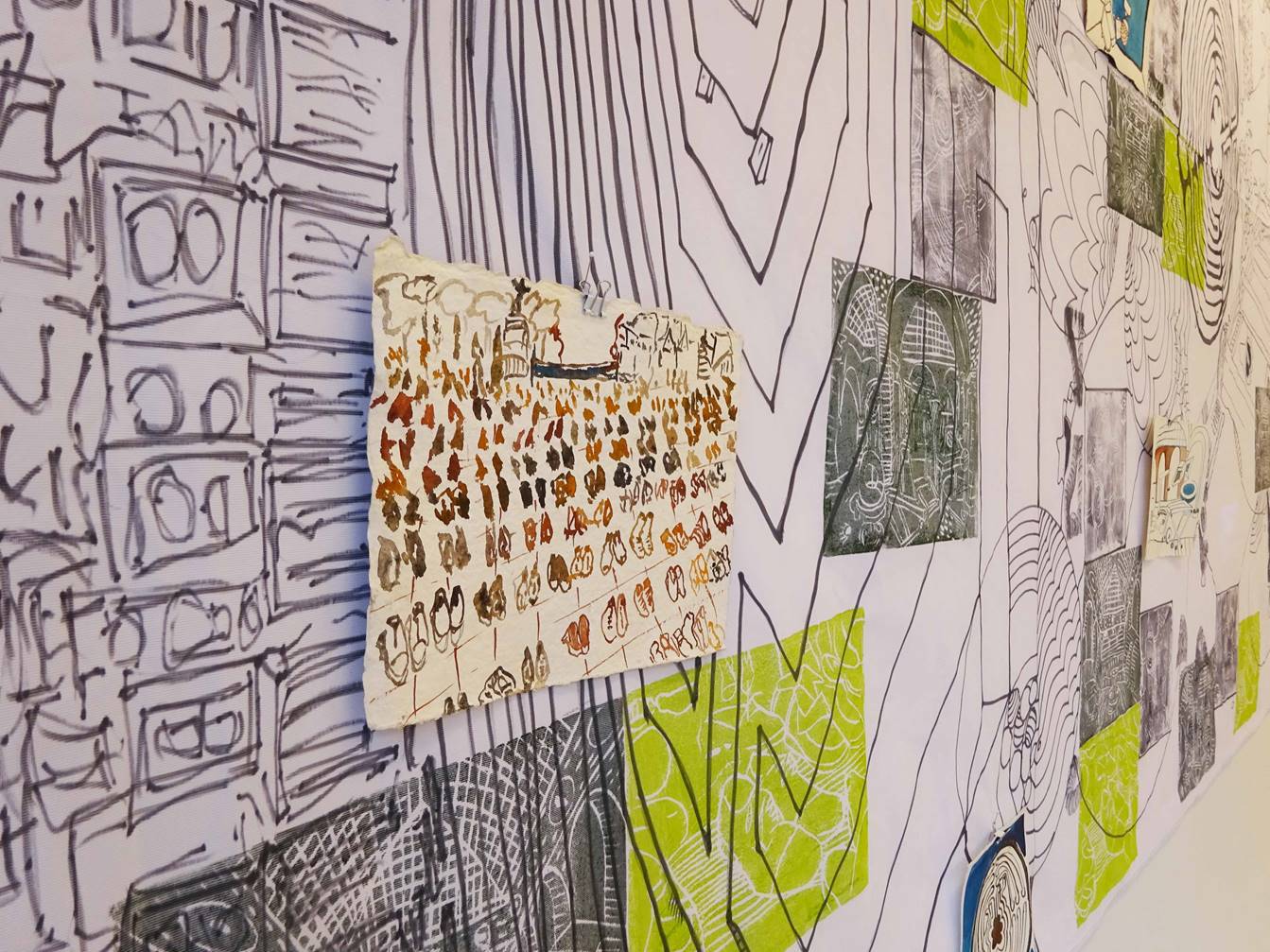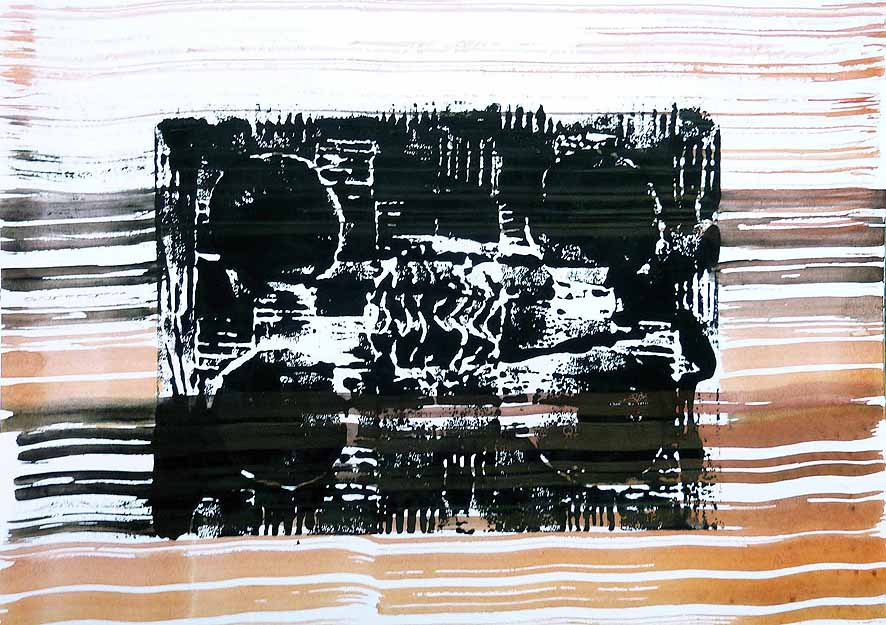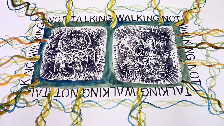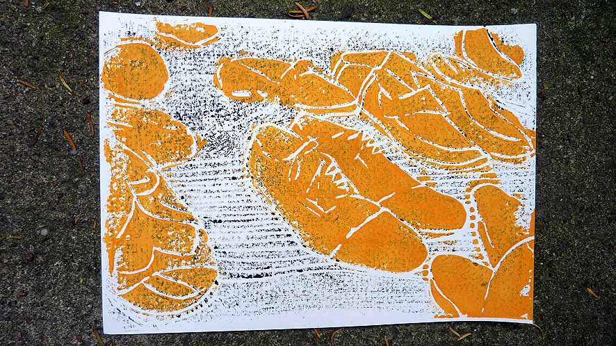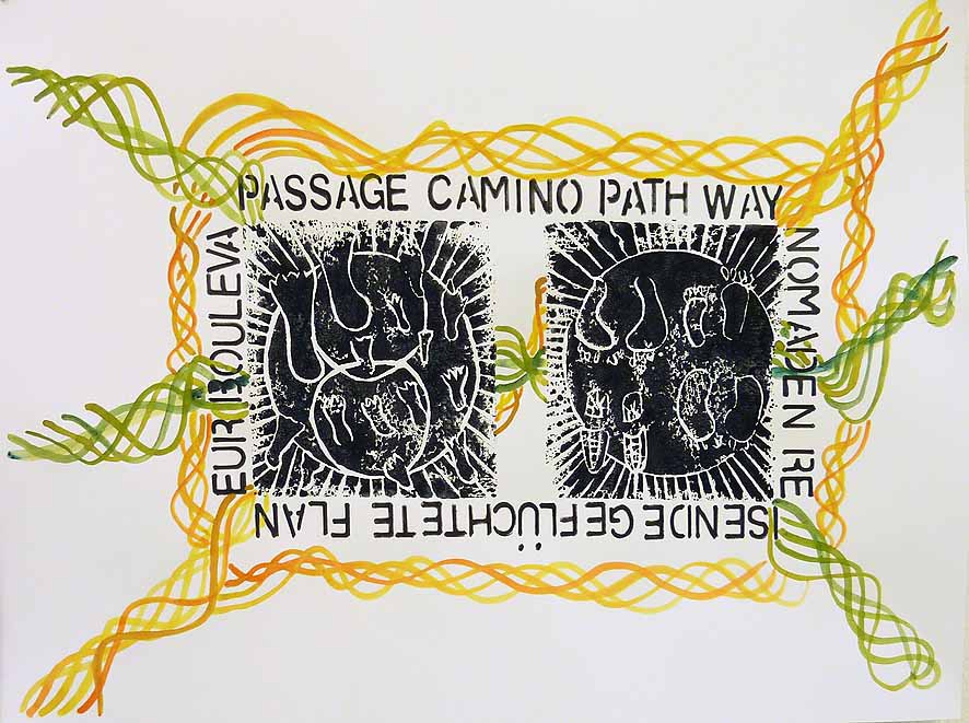 Das Thema Nomadentum begleitet die Menschheitsgeschichte von Beginn an und gewinnt in der Gegenwart mit der zunehmenden Ressourcenknappheit immer größerer Bedeutung. Nele Ströbel verbindet das Phänomen mit dem Thema Mobilität im Allgemeinen, die sich nach den vorhandenen Ressourcen richtet, und dem meditativen Pilgern im Speziellen. Im Kontext des meditativen Pilgerns entdeckte die Künstlerin u.a. die Papstschuhe, die sie in dieser Ausstellung mehrfach in verschiedenen Varianten im Linoldruck wiederfinden.