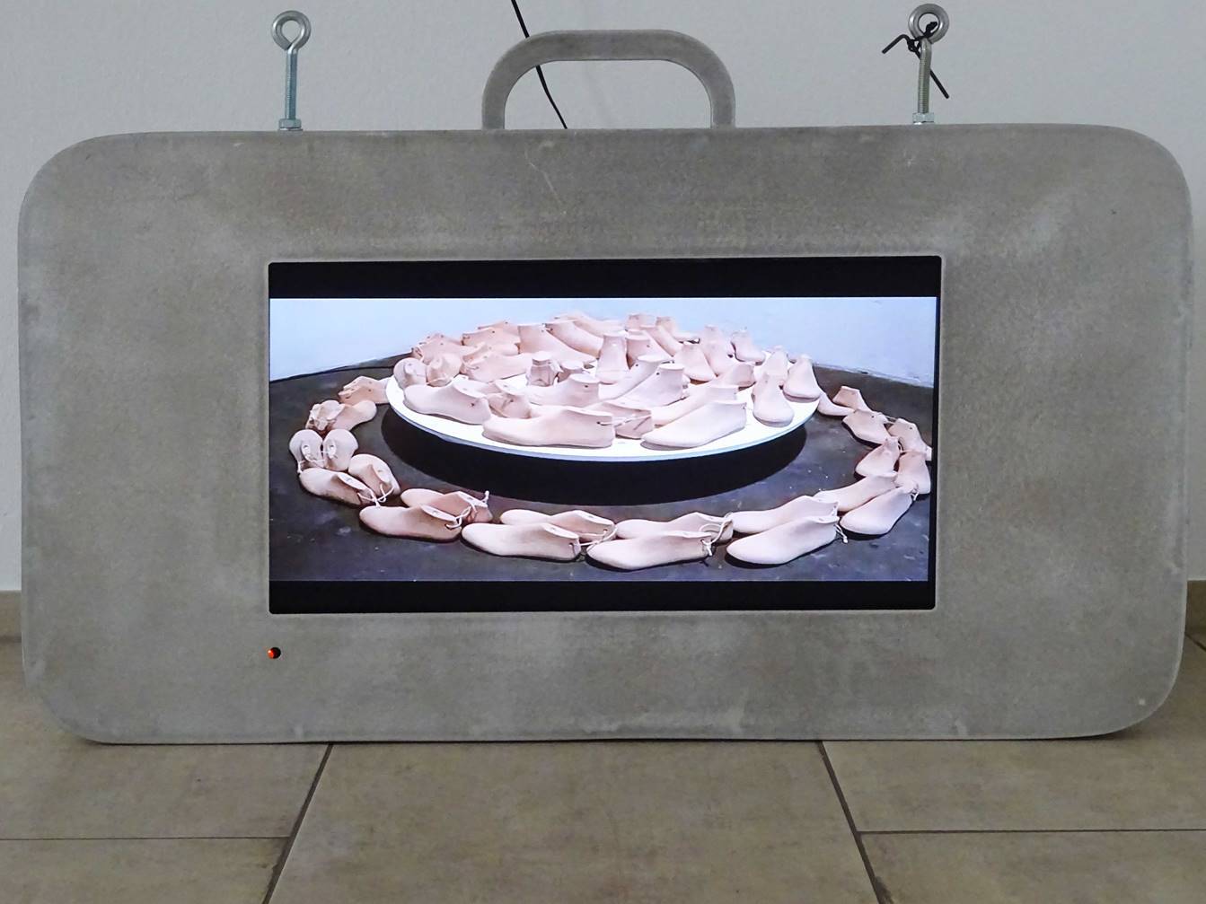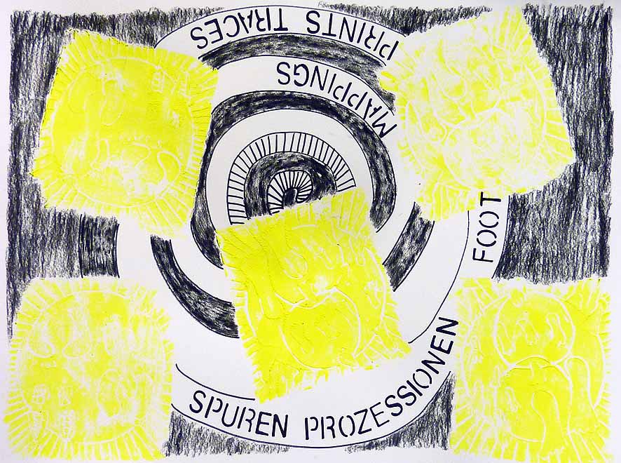 In ihrer Kunst abstrahiert und reduziert die Künstlerin das Bild: „Spuren“ lauten die Titel dieser Arbeiten und man assoziiert mit dem vereinzeltem Paar Schuhe auch die Fußspuren Christi, die in der christlichen Ikonographie des Himmelfahrtstages einen festen Platz eingenommen haben. Sie sehen allein mit dem Bild der Papstschuhe wie komplex die Aussagen der Exponate sind.